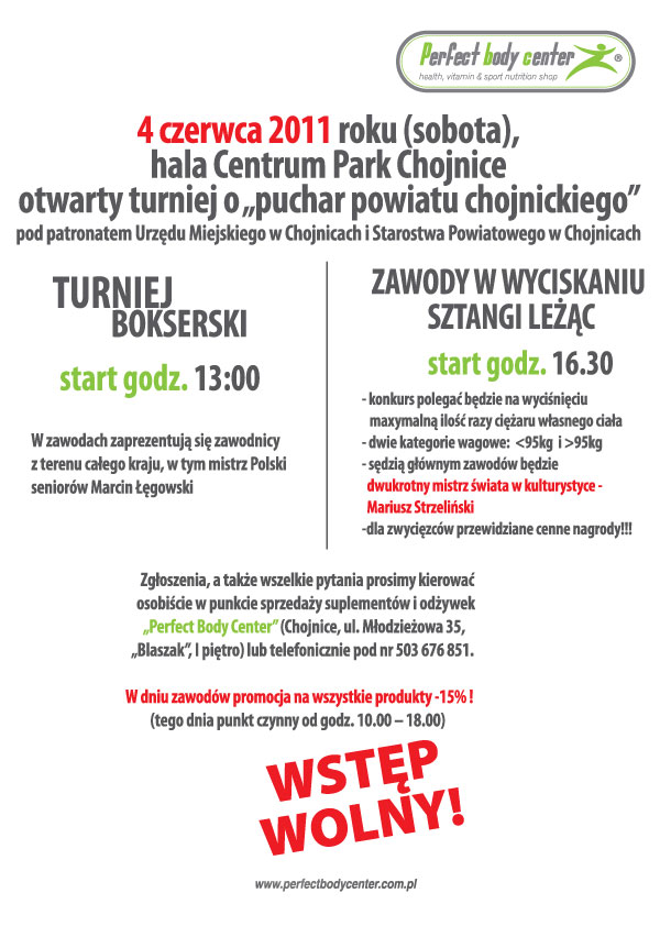 Sędzią głównym i gościem honorowym będzie dwukrotny Mistrz Świata w kulturystyce Mariusz Strzeliński. Do rywalizacji przystąpią zgłoszeni wcześniej zawodnicy. Zgłoszenia, a także pytania można kierować w punkcie sprzedaży odżywek i suplementów „Perfeckt Body Center” (Chojnice ul. Młodzieżowa 35 „Blaszak” I piętro) lub pod numerem tel. 503 676 851. Zgłoszenia przyjmujemy do dnia zawodów.