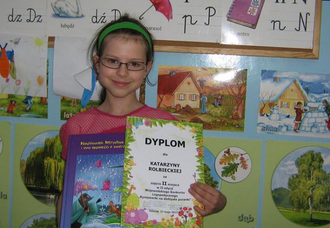 Katarzyna Rolbiecka uczennica klasy II ze Szkoły Filialnej w Przymuszewie zajęła II miejsce w II Edycji Wojewódzkiego Konkursu Logopedycznego "Rymowanki na dżdżyste poranki”.