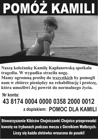 Stowarzyszenie Kibiców Chojniczanki Chojnice, solidaryzując się z poszkodowaną w wypadku Kamilą Kapłanowską, organizuje zbiórkę pieniędzy podczas najbliższego meczu ligowego z Górnikiem Wałbrzych.