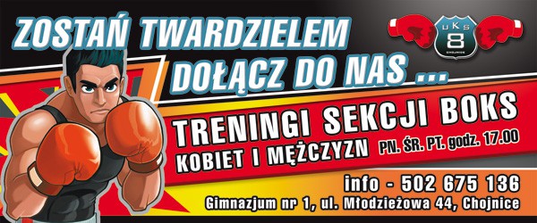 Sekcja pięściarska Uczniowskiego Klubu Sportowego „Ósemka” Chojnice zaprasza!!! Prowadzimy nabór wśród chłopców i dziewcząt w wieku szkolnym. W programie znajdują się zajęcia z zakresu sprawności ogólnorozwojowej oraz specjalistycznej taktyki pięściarskiej.