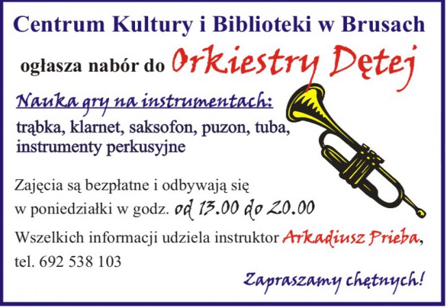 Centrum Kultury i Biblioteki im. Jana Karnowskiego w Brusach ogłasza nabór dzieci i młodzieży do Orkiestry Dętej. Bezpłatne zajęcia obejmują grę na instrumentach takich jak: trąbka, klarnet, saksofon, puzon, tuba, instrumenty perkusyjne.