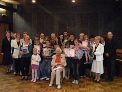 Całe spotkanie uświetniły występy dzieci i młodzieży uczęszczającej na zajęcia w Centrum Kultury i Biblioteki. Na początku spotkania suitę lubelską zatańczyła grupa Młodzi Krëbane prowadzona przez Panią Katarzynę Kamrowską. Następnie Zosia Gierszewska zagrała na pianinie Melodię francuską w opracowaniu Czernego, Kentucky blues oraz Sostenuto z utworów na 4 ręce Samuela Majkapara, natomiast Asia Łosińska zagrała Etiudę nr 7 Carla Gurlitta, Nad pięknym modrym Dunajem Straussa oraz Drammatico z utworów na 4 ręce. Wykonawców przygotowała Pani Anna Stoltmann. Spotkanie zakończył występ 2 par z grupy Młodzi Krëbane - Moniki Szmaglik i Zbigniewa Woltera oraz Darii Leszczyńskiej i Mateusza Dolnego, którzy zatańczyli dla laureatów Polkę.