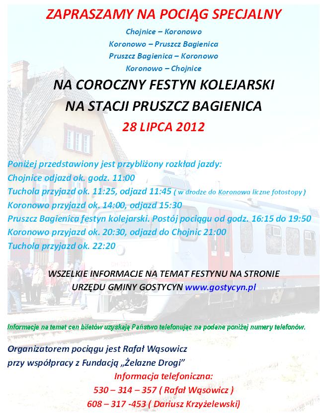 Miłośnik kolei Rafał Wąsowicz przy współpracy z Fundacją "Żelazne drogi" 28 lipca organizuje pociąg specjalny z Chojnic do Koronowa. Po drodze w Pruszczu Bagienicy odbędzie się festyn kolejarski.