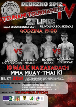 W piątek 27 lipca 2012 w Debrznie o godzinie 19.00, odbędzie się gala MMA, MUAY THAI i K1 „Tsunami Tornament Debrzno 2012" organizowana przez Klub Tsunami Gold Team, Centrum Kultury Sportu i Turystyki w Debrznie.