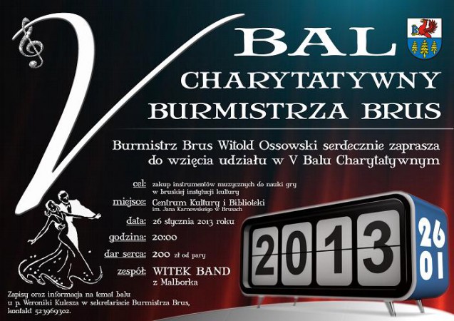 Burmistrz Brus Witold Ossowski zaprasza na V Bal Charytatywny Burmistrza Brus. Dochód z tegorocznej imprezy zostanie przeznaczony na zakup instrumentów muzycznych do nauki gry w bruskiej instytucji kultury.
