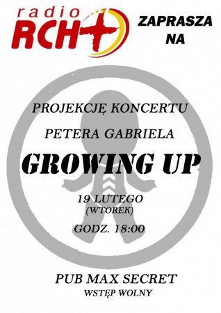 W najbliższy wtorek 19 lutego w pubie Max Secret odbędzie się kolejny muzyczny wieczór z niezwykłym koncertem na DVD. „Growing Up Live" zostało nagrane podczas dwóch wieczorów w Filoforum w Mediolanie w maju 2003 roku. Całe wydarzenie reżyserował Hamish Hamilton. Na płycie zawarto ponad 130 minut niezwykłego rockowego teatru, jaki stworzyć potrafi tylko Peter Gabriel...