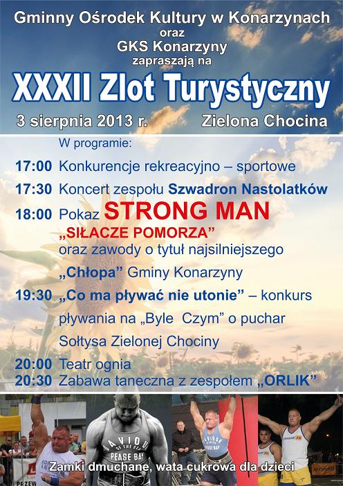 3 sierpnia w Zielonej Chocinie odbędzie się XXXII Zlot Turystyczny, organizowany przez Gminny Ośrodek Kultury w Konarzynach oraz GKS Konarzyny. Początek o godz. 17. W programie konkursy, pokaz Strong Man, konkurs pływania na byle czym o puchar sołtysa, teatr ognia i zabawa taneczna.
