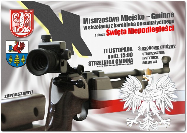 Zapraszamy do uczestnictwa w X Mistrzostwach Miejsko-Gminnych w strzelaniu z karabinka pneumatycznego z okazji 95. rocznicy Odzyskania Niepodległości. Zawody odbędą się 11 listopada o godzinie 15:00 w strzelnicy gminnej przy Gimnazjum w Brusach (wejście od strony KLO). Do uczestnictwa w mistrzostwach zapraszamy trzyosobowe drużyny: żeńskie, męskie lub mieszane, reprezentujące sołectwa, stowarzyszenia oraz instytucje z terenu miasta i gminy Brusy.