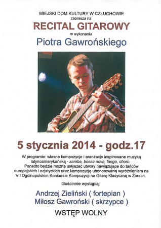 Miejski Dom Kultury zaprasza 5 stycznia (g. 17) na recital gitarowy w wykonaniu Piotra Gawrońskiego. W programie własne kompozycje i aranżacje inspiowane muzyką latynoamerykańską. Gościnnie wystąpią: Andrzej Zieliński - fortepian i Miłosz Gawroński - skrzypce.