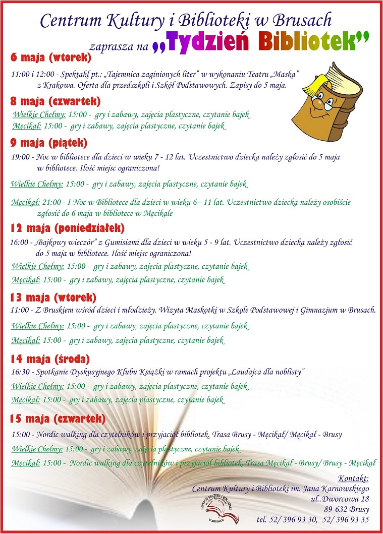 Tydzień Bibliotek w Brusach kończy się spotkaniem „Nordic walking z biblioteką” w dniu 15 maja, w czwartek o godz. 15.00. Uczestnicy spotkania: czytelnicy, użytkownicy i przyjaciele bibliotek będą maszerować „Kaszubską marszrutą” w kierunku: Brusy – Męcikał; Męcikał – Brusy. W połowie trasy planowany jest piknik. Następnie uczestnicy rozejdą się do swoich miejscowości. Wymarsz: Brusy, spod budynku CKiB ul. Dworcowa 18 oraz Męcikał, przy budynku filii bibliotecznej, ul. Bruska 3.