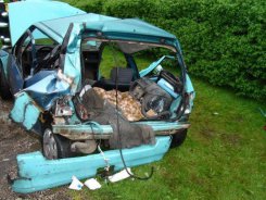 29.05.2007 W Topolach gm.Chojnice, samochód ciężarowy najechał na tył osobowego Citroena AX. W wyniku uderzenia, tył osobówki został zmiażdżony.