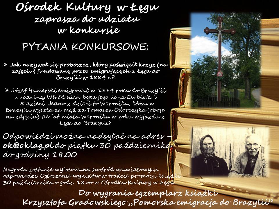 Ośrodek Kultury w Łęgu zaprasza do udziału w konkursie związanym z książką Krzysztofa Gradowskiego „Pomorska Emigracja do Brazylii w II połowie XIXw.”. Szczegóły na plakacie poniżej.