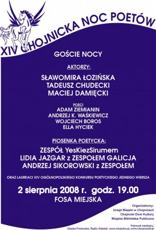Kilka dni pozostało do jednego z ważniejszych wydarzeń kulturalnych tegorocznego lata w Chojnicach. 2 sierpnia XIVChojnicka Noc Poetów. Na ucztę dla duszy zapraszają Burmistrz Miasta Chojnice, Miejska Biblioteka Publiczna i Chojnicki Dom Kultury.