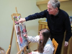 Od kilku ostatnich zajęć uzdolnieni wychowankowie podjęli wyzwanie namalowania profesjonalnymi farbami olejnymi obrazu na płótnie. Sztuka ta nie należy do najprostszych, ponieważ najpierw płótno trzeba zagruntować, a dopiero potem wykonać szkic obrazu. Kolejnym etapem jest wykonanie podmalówki, na którą po wyschnięciu nakłada się kolejne warstwy farb. Końcowym efektem są piękne, wielobarwne obrazy, które przyciągają oko zwiedzających.