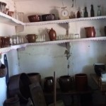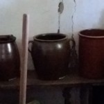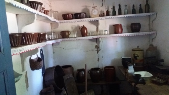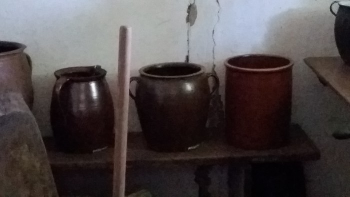 W starodawnych drewnianych chatach można było zobaczyć między innymi gliniane naczynia użytku domowego: zastawy stołowe, garnki, misy, dzbany i konwie.