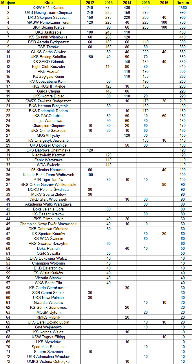 Wydział Sportowy Polskiego Związku Bokserskiego opracował niezwykle interesującą klasyfikację klubową, odzwierciadlającą wyniki sportowe (z lat 2012-2016) wszystkich międzynarodowych turniejów mistrzowskich (Igrzysk Olimpijskich, mistrzostw świata, Europy oraz Igrzysk Europejskich). W tym unikalnym rankingu 73 klubów na drugim miejscu sklasyfikowano KS Boxing Team Chojnice (990) wyprzedzając, BKS Skorpion Szczecin (960), MKSW Pomorzanin Toruń (700) i SKK Boxing Kielce (500).