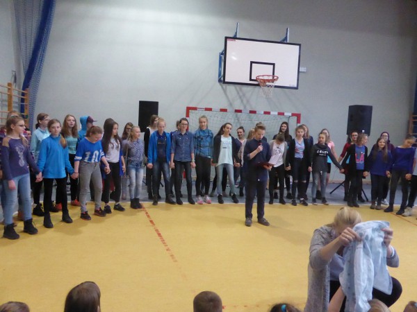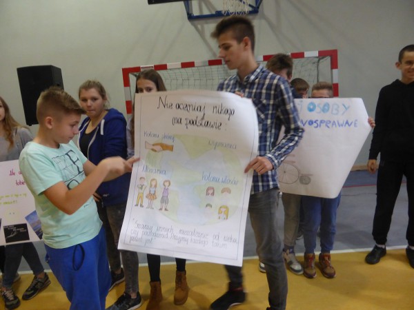 Liderzy profilaktyki pod opieką pedagoga - Ludwiki Mogi przygotowali widowisko słowno-muzyczne dotyczące szacunku dla osób innego wyznania, narodowości, rasy, osób niepełnosprawnych, o innych poglądach, o innym usposobieniu i zwyczajach, a także gustach (np. muzycznych).