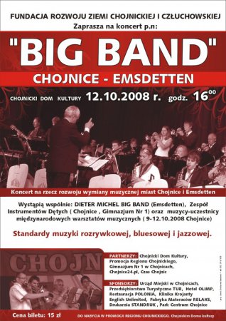 BIG BAND DIETERA MICHELA z Emsdetten gościliśmy już na scenie Chojnickiego Domu Kultury w lutym tego roku, stanowił oprawę muzyczną Dokonań Roku 2007 , oraz zagrał koncert otwarty w sobotę 23.02.08. Występy BigBandu okazały się sukcesem. Wrześniowy koncert będzie zwieńczeniem wspólnej pracy muzyków z miast partnerskich oraz motywacją do kolejnych wspólnych przedsięwzięć.