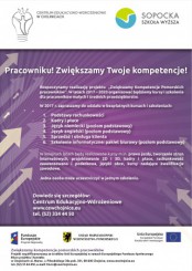 Centrum Edukacyjno-Wdrożeniowe w Chojnicach we współpracy z Sopocką Szkołą Wyższą, otrzymało dofinansowanie na realizację projektu „Zwiększamy kompetencje pomorskich pracowników”, skierowanego do mieszkańców województwa pomorskiego. Dzięki temu do 2020 r. pracownicy sektora małych i średnich przedsiębiorstw (w tym osoby prowadzące działalność gospodarczą) mogą skorzystać z bogatej oferty bezpłatnych kursów i szkoleń, mających na celu zdobycie kwalifikacji oraz kompetencji niezbędnych na rynku pracy.