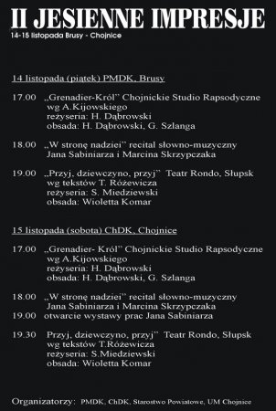 Od 14 do 15 listopada w Chojnicach i Brusach odbywać się będą Jesienne Impresje. Zapoznaj się z programem!Podobne tematy: