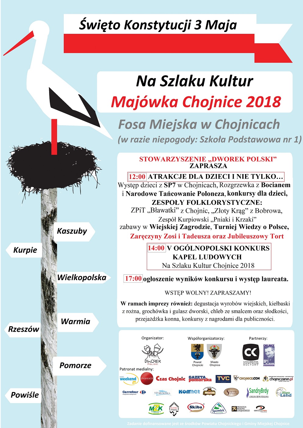W Święto Konstytucji 3 Maja Stowarzyszenie „Dworek Polski” już po raz piąty zaprasza mieszkańców Powiatu Chojnickiego i turystów do Fosy Miejskiej w Chojnicach (w razie niepogody do Szkoły Podstawowej nr 1 w Chojnicach) na imprezę „Na Szlaku Kultur Majówka Chojnice 2018”.