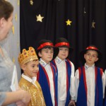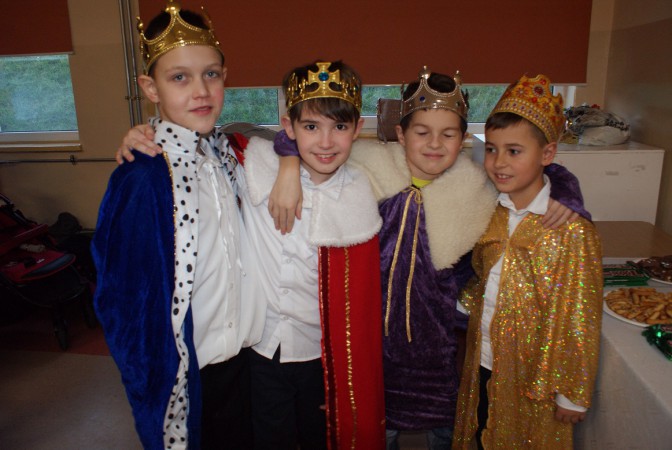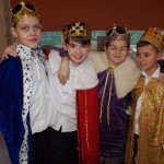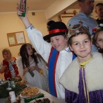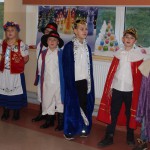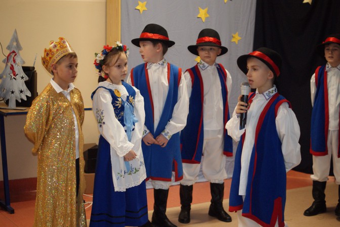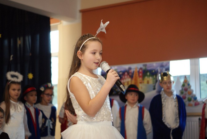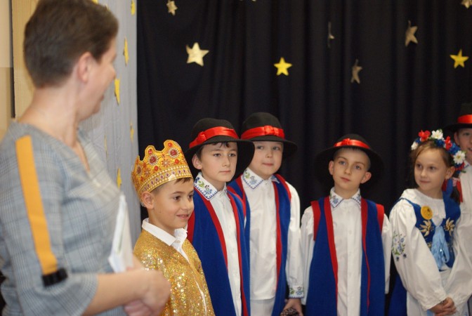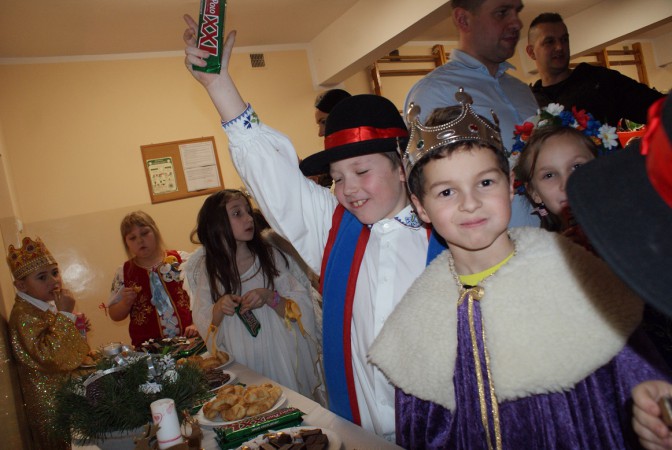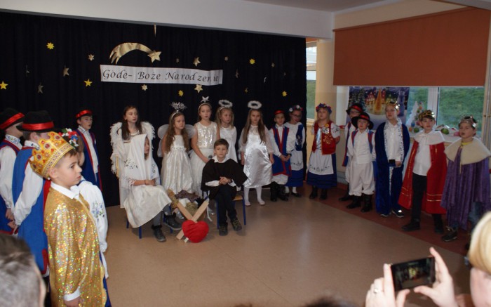 Uczniowie klasy II b do występu przygotowywali się od kilku tygodni. Na zajęciach ćwiczyli swoje role i dzielili się kostiumami. Dziewczynki znosiły z domu sukienki dla swoich koleżanek a chłopcy królewskie szaty. Najpierw wychowankowie Barbary Kin zagrali przed kolegami z II i III klasy. Ostatni występ przed świętami (20.12) był dla rodziców. Co ważne, w jego trakcie dzieci, też nie zapomniały o wzajemnej pomocy. Gdy Uli trema odebrała głos w mig pojawiły się u jej boku Wiktoria i Laura. Obecność najbliższych sprawiła, że emocje sięgnęły zenitu! A rodzice starali się uwiecznić te niepowtarzalne chwile chwytając za swoje smartfony. Młodzi aktorzy i Zbigniew Piekarski, który przygrywał na akordeonie, zostali nagrodzeni zasłużonymi brawami. Po wręczeniu rodzicom drobnych upominków, mydełek wykonanych na warsztatach w Centrum Edukacji Przyrodniczej w Chocińskim Młynie, nie pozostało już nic innego jak udać się do słodkiego bufetu!