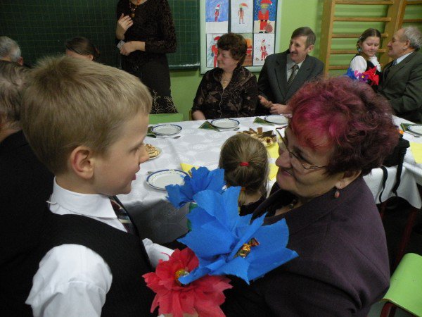 Z tej okazji przygotowali specjalne wiersze i piosenki a Michał L. zagrał na keyboardzie. Rodzice uczniów klasy O i I przygotowali także słodki poczęstunek, a wnukowie specjalnie wykonane na tę okazję kwiaty.