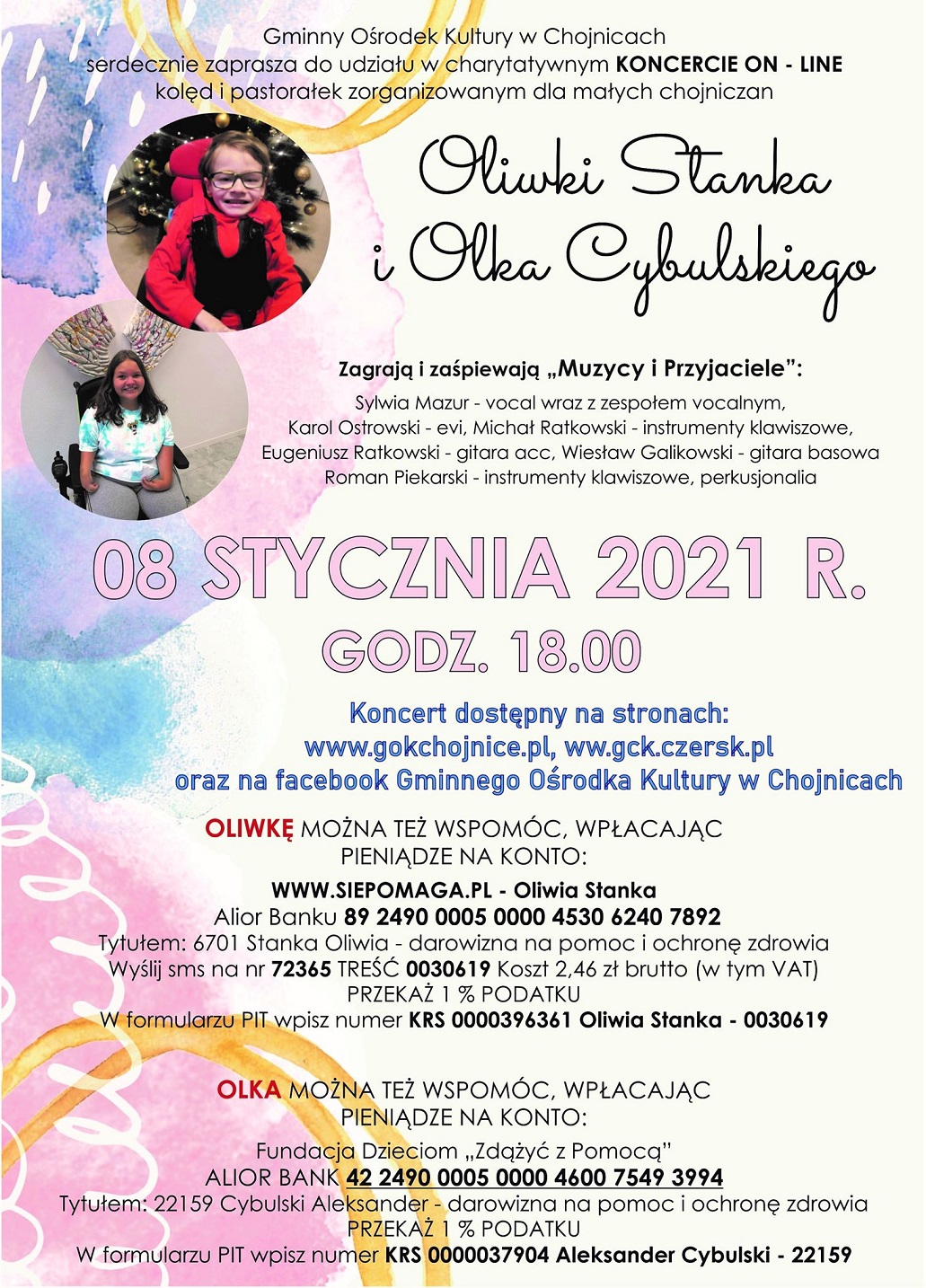 Gminny Ośrodek Kultury w Chojnicach zaprasza 8 stycznia 2021 r. (piątek) o godz. 18:00, do udziału w koncercie charytatywnym na rzecz Oliwki Stanki i Olka Cybulskiego. W tym roku wydarzenie przyjmie formę on-line, będzie dostępne na stronach www.gokchojnice.pl, www.gck.czersk.pl oraz na facebook-u GOK.