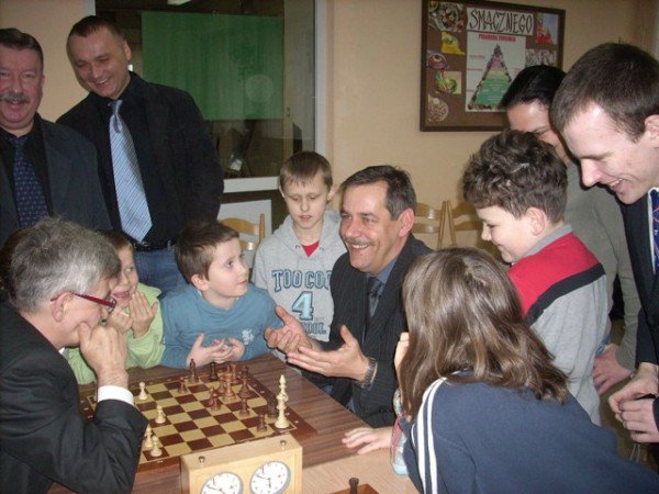 Dlatego też do inauguracyjnego pojedynku przy szachownicy zasiedli dwaj burmistrzowie – Arseniusz Finster oraz Jan Zieliński rozgrywając partię zakończoną remisem. Następnie przyjęli wyzwanie ze strony najmłodszych adeptów „Królewskiej gry”. Nasi włodarze wsparci przez reprezentanta mediów – Radosława Osińskiego (który w noc poprzedzającą zawody zaczął zgłębiać arkana gry szachowej, by stawić czoła wyzwaniu) oraz sympatyka szachów – Mariusza Janika, rozegrali mecz na czterech szachownicach zakończony wynikiem 3,5 : 0,5 dla drużyny maluchów. Walka była niekonwencjonalna, bo w myśl zasady „Bawmy się razem”, a więc wyjątkowo i podpowiadanie było dozwolone, niemniej jednak tylko burmistrz Finster zdołał wywalczyć remis z Olą Kamińską. Umiejętnościom oraz urokowi osobistemu pięcioletniego Kubusia Janty – Lipińskiego nie oparł się Jan Zieliński, także Radosław Osiński musiał uznać wyższość i urok Natalki Winiarskiej, a Mariusz Janik uległ doświadczonemu (ranking 1800) elblążaninowi – dziewięcioletniemu Igorowi… Janikowi.