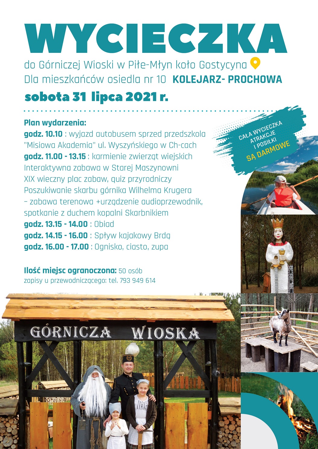 Wycieczka do Górniczej Wioski koło Gostycyna organizowana przez zarząd Osiedla nr 10 odbędzie się 31 lipca (sobota). Wydarzenie jest w całości finansowane z budżetu osiedla i przeznaczone zarówno dla dzieci, jak i dorosłych. Na ten moment jest jeszcze 15 wolnych miejsc, to też szefujący "dziesiątce", Michał Gruchała, zachęca osoby zainteresowane wycieczkę do zapisywania się (nr tel. 793949614). Program wyjazdu na plakacie poniżej.
