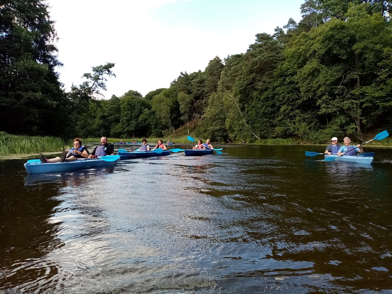 Następnie chojniczanie udali się na spływ kajakowy rzeką Brdą. Dla wielu z nich był to pierwszy spływ w życiu. Ale wszyscy sobie doskonale poradzili, a pogoda dopisywała wyjątkowo. Na polu biwakowym w sąsiedniej miejscowości był czas uzupełnić kalorie spalone przy wiosłowaniu. Uczestnicy wyjazdu dzielili się swoimi wypiekami i zupą. Wydarzenie zakończyło się ogniskiem.