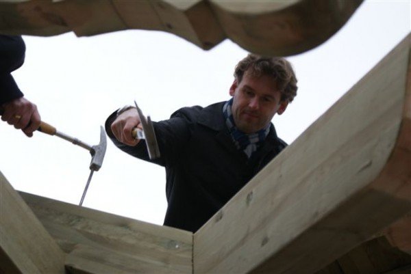 Ostatnia krokiew przybita, ale na końcowy kształt ośrodka żeglarskiego i przystani w Swornegaciach przyjdzie jeszcze trochę poczekać...Wczoraj Mateusz Kusznierewicz razem z wspólnikiem Andrzejem Lemanem przybili ostatnią krokiew na budynku przystani i zawiesili wieniec. Na pokrycie czeka dach, a budynek trzeba jeszcze wykończyć.