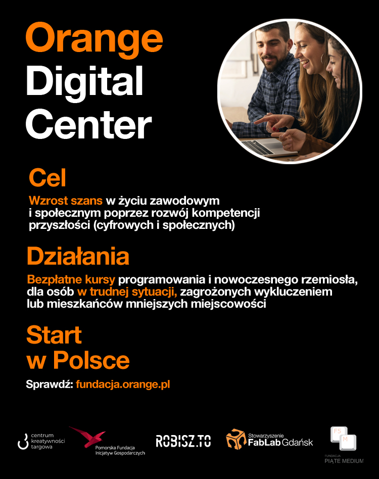 Wsparcie w rozwoju kompetencji przyszłości, niezbędnych nie tylko w pracy, ale i w codziennym życiu, daje program społeczny Orange Digital Center (ODC). To międzynarodowa inicjatywa, którą w Polsce koordynuje Fundacja Orange. Jednym z elementów ODC jest Szkoła Kodowania - bezpłatny, profesjonalny kurs dla osób w trudniejszej sytuacji, a poszukujących możliwości zmiany i rozwoju.