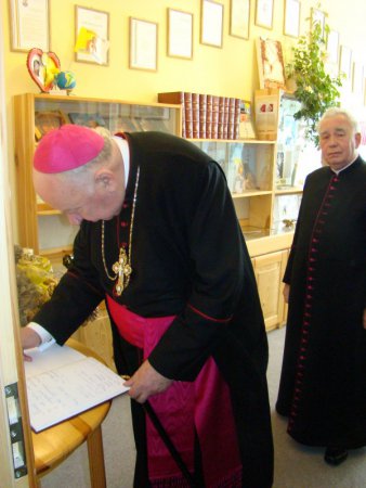 Ksiądz biskup uczestniczył w przedstawieniu wykonanym przez uczniów klasy IIIa upamiętniającym rocznicę urodzin naszego Papieża. Następnie przybyli goście odwiedzili Izbę Pamięci Jana Pawła II gdzie ksiądz biskup dokonał wpisu do księgi pamiątkowej zostawiając szczególny znak swojej obecności w szkole.