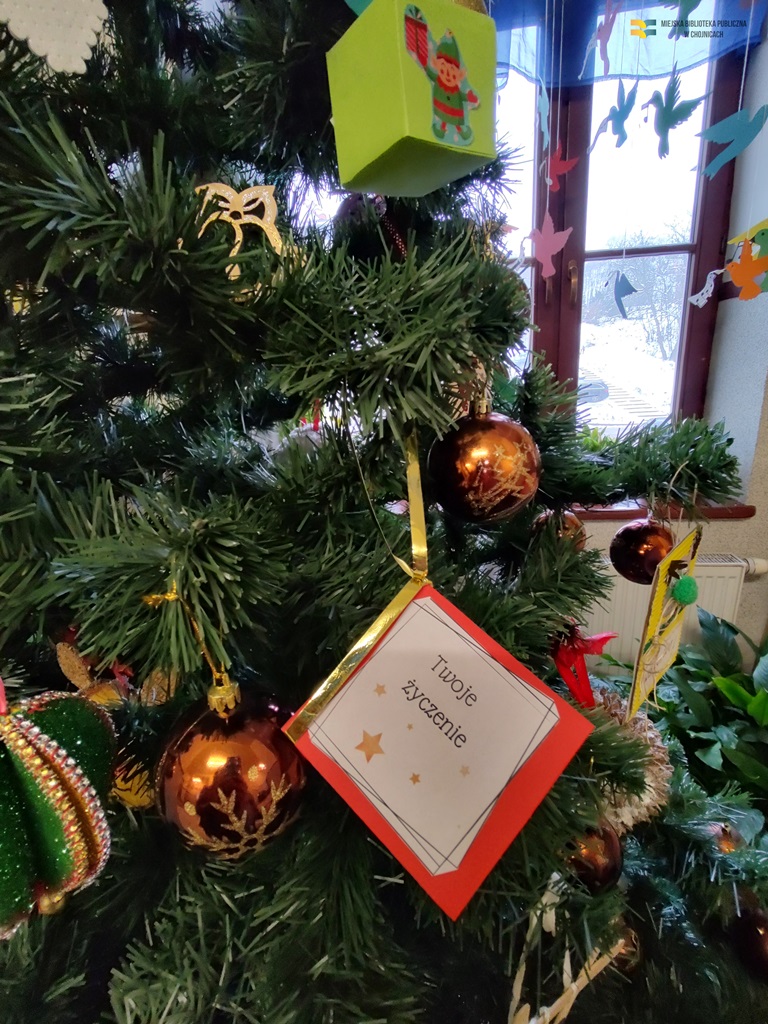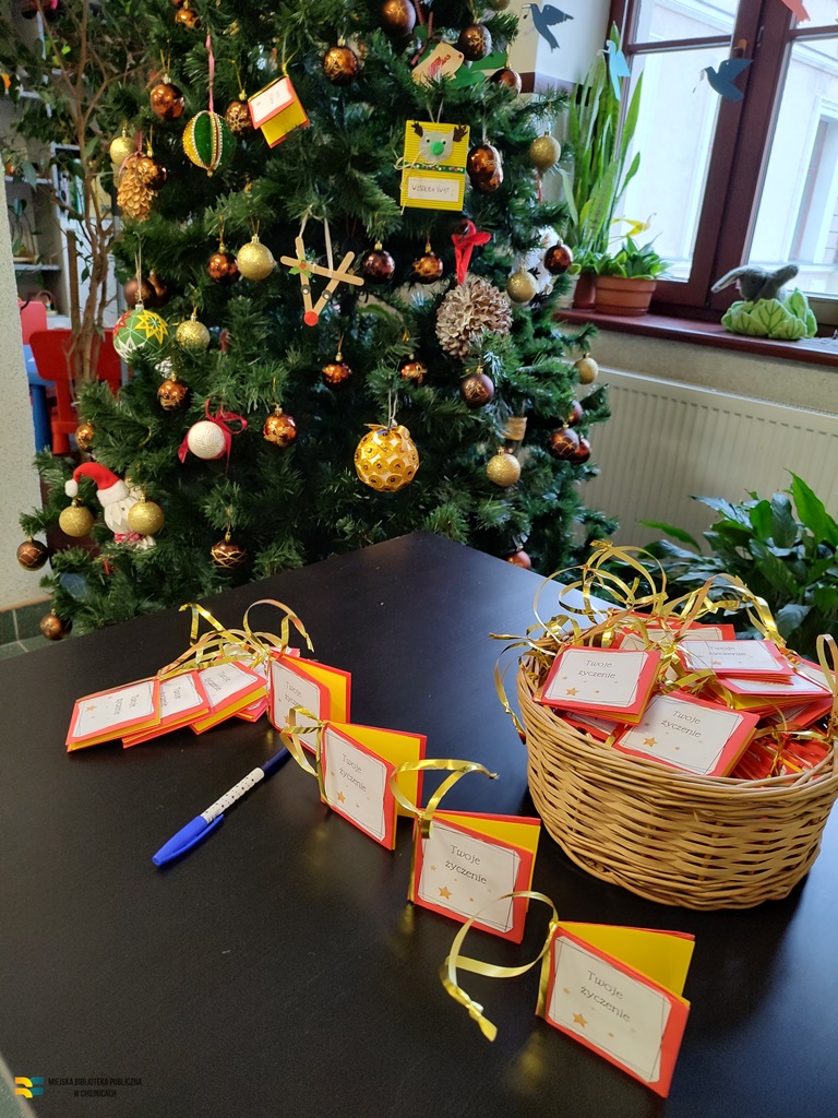 W holu Miejskiej Biblioteki Publicznej w Chojnicach w środę 6 grudnia 2023 roku, w mikołajki, stanęła choinka dobrych życzeń, na której można wieszać książeczki z życzeniami dla innych czytelników.