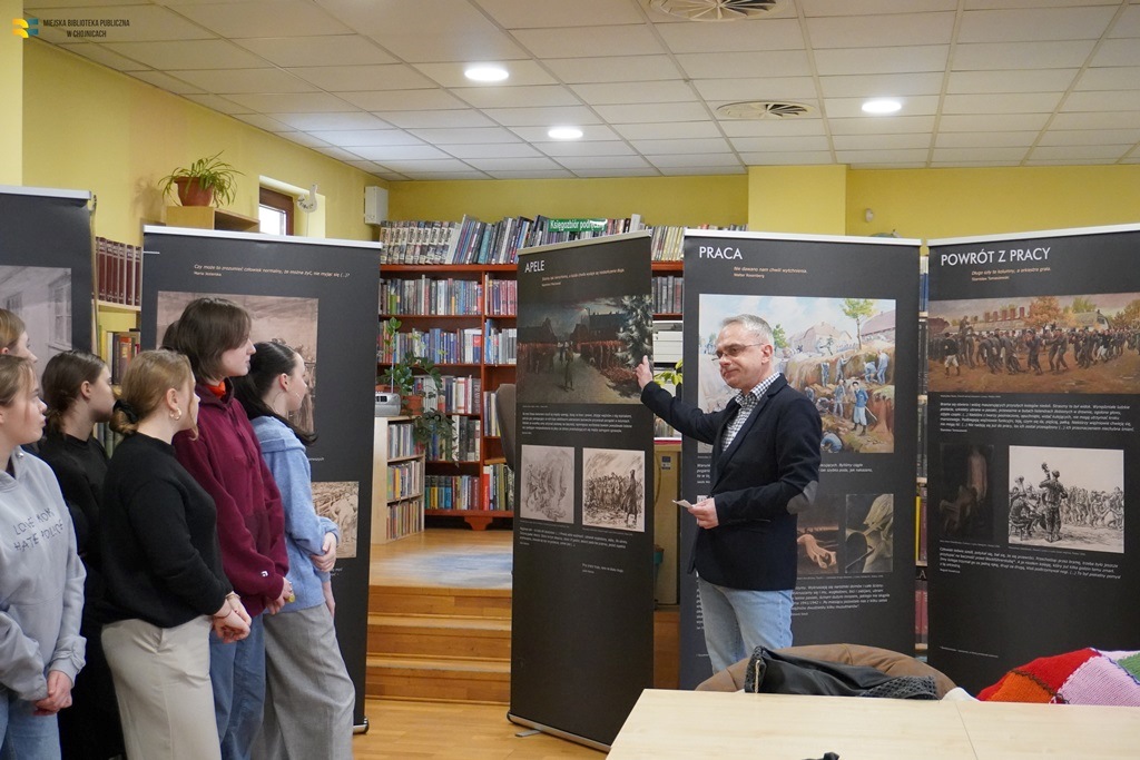 Do Czytelni Miejskiej Biblioteki Publicznej w Chojnicach przyszły kolejno trzy klasy wraz z nauczycielami. Wprowadzenie do wystawy przedstawił licealistom Marcin Wozikowski z Klubu „Tygodnika Powszechnego” w Chojnicach. Prelegent mówił m.in. o holokauście i polityce III Rzeszy wobec Żydów, przybliżył tematykę niektórych eksponowanych plansz.