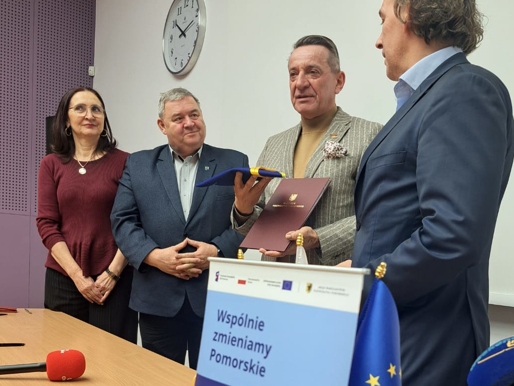 Umowa dotycząca realizacji unijnego projektu „Nastaw się na rozwój” została podpisana. W wydarzeniu uczestniczyli starosta chojnicki Marek Szczepański, wicestarosta Jacek Klajna oraz skarbnik Elżbieta Smaglinska.