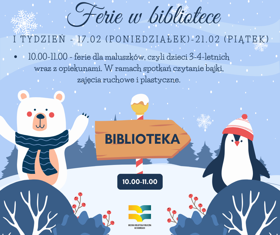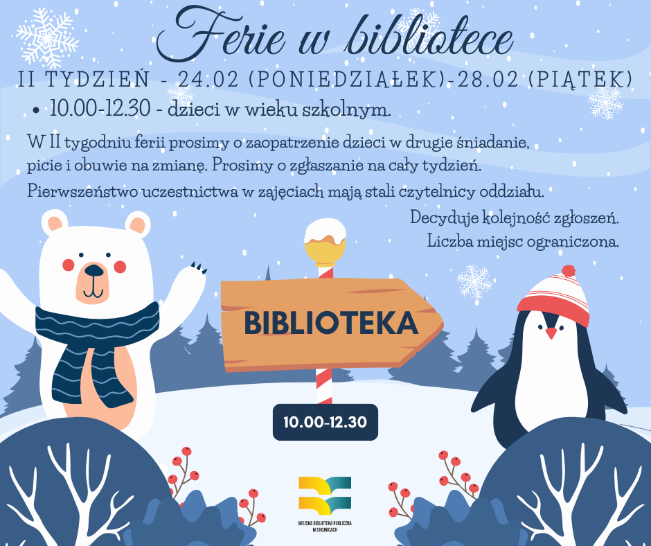 Wypożyczalnia i Czytelnia dla Dzieci Miejskiej Biblioteki Publicznej w Chojnicach zaprasza wielbicieli książek na zajęcia w trakcie ferii zimowych.