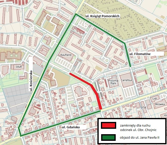Objazd do ul. Jana Pawła II poprowadzony zostanie ulicami: Książąt Pomorskich i Filomatów. Jednocześnie informujemy, iż Wykonawca zapewni możliwość dojazdu i dojścia do przyległych do placu budowy nieruchomości i instytucji.