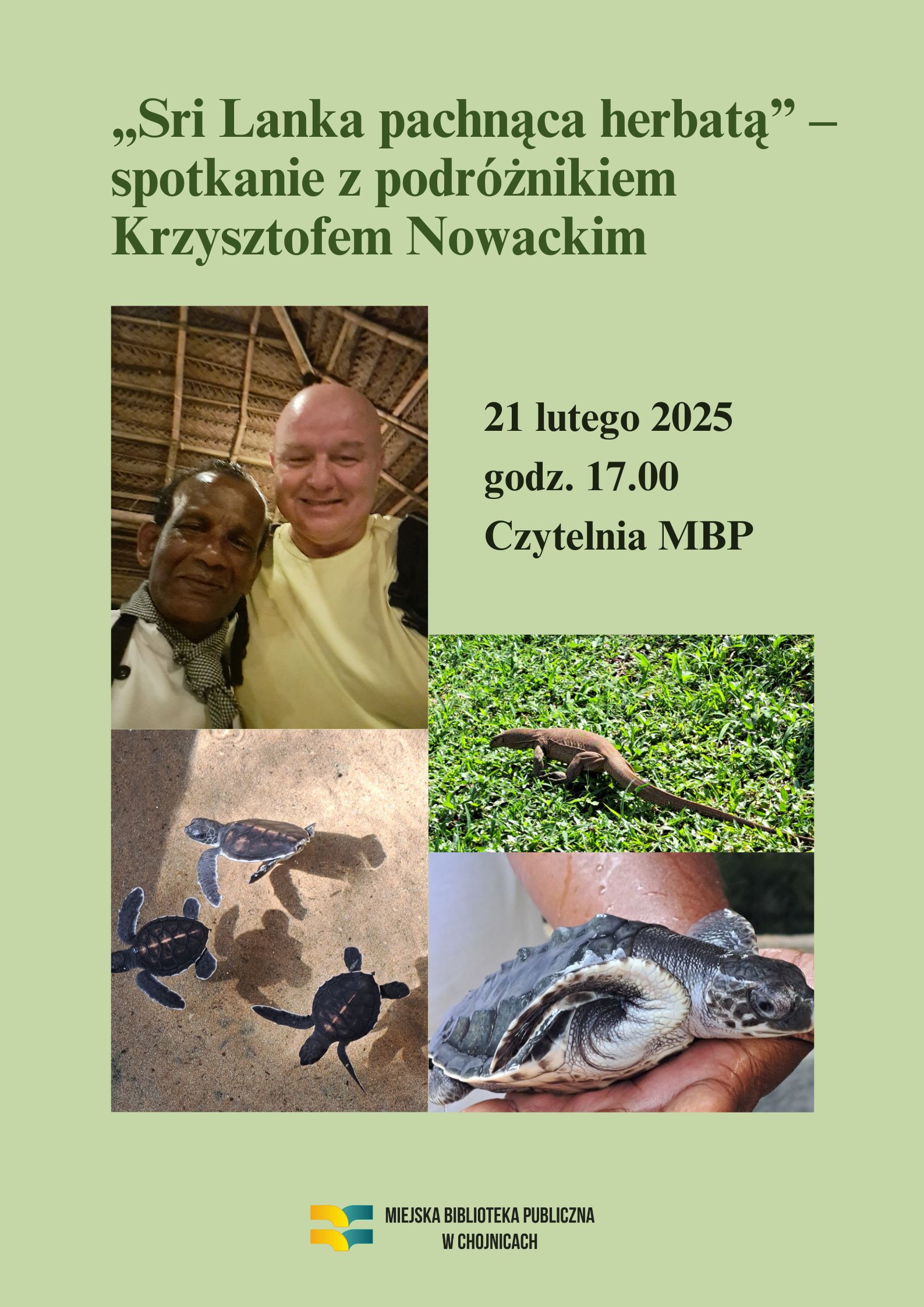 W piątek 21 lutego 2025 roku w Czytelni Miejskiej Biblioteki Publicznej w Chojnicach odbędzie się spotkanie z podróżnikiem Krzysztofem Nowackim zatytułowane „Sri Lanka pachnąca herbatą”. Początek o godz. 17:00.