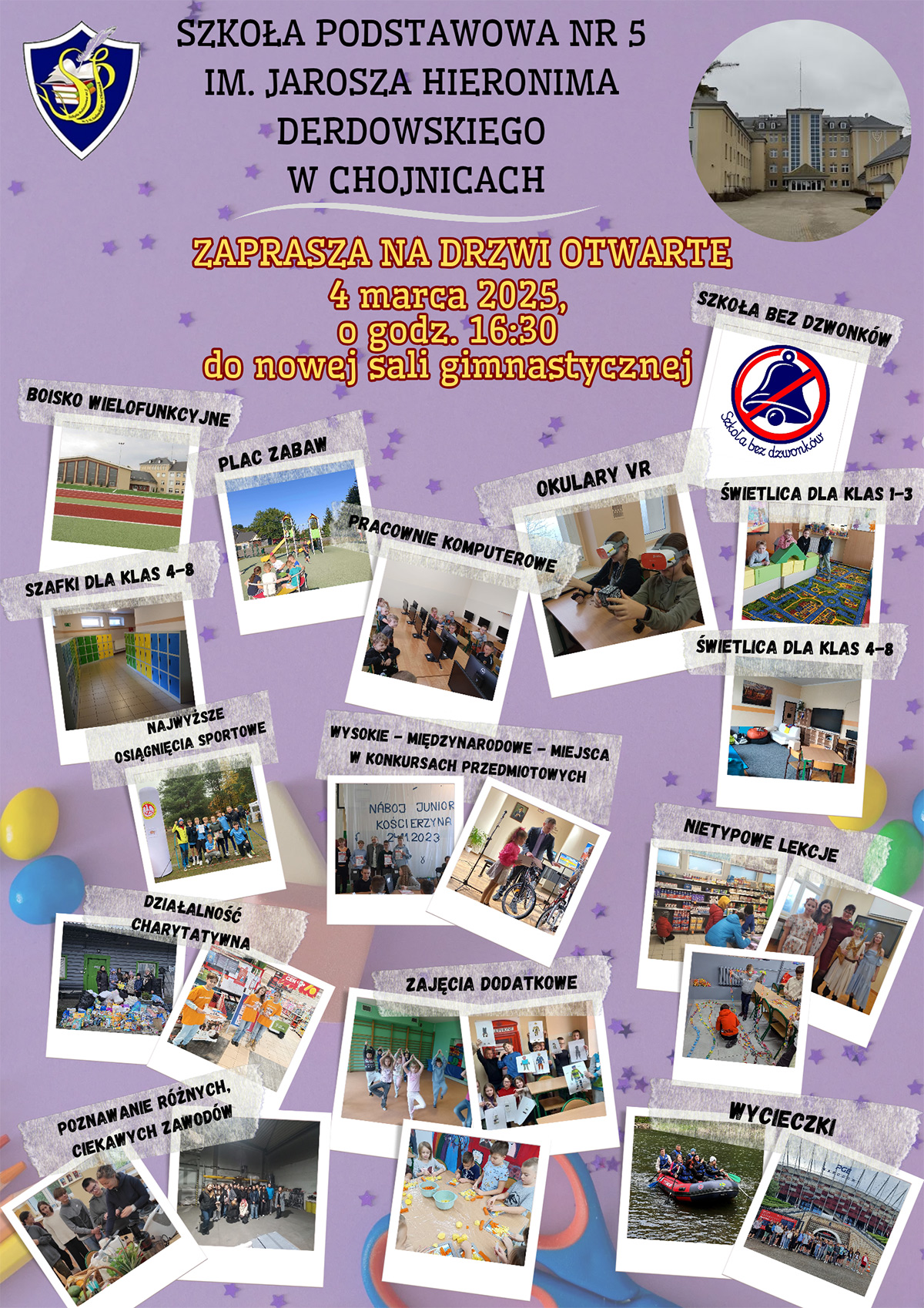 Serdecznie zapraszamy na Drzwi Otwarte w Szkole Podstawowej nr 5 w Chojnicach, które odbędą się 4.03.2025 o 16:30. Do udziału w tym wydarzeniu zaprasza Dyrekcja wraz z całą społecznością szkolną.