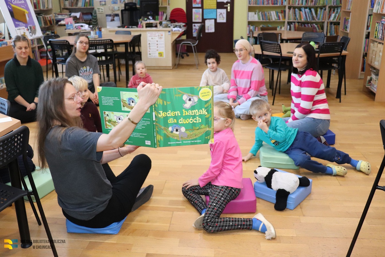 W środę 19 lutego 2025 roku w Wypożyczalni i Czytelni dla Dzieci odbyły się kolejne zajęcia dla przedszkolaków wraz z rodzicami. Tym razem bibliotekarka zaprosiła wszystkich do wysłuchania historyjki o misiu koali, który bardzo chciał pójść spać. Książka nosiła tytuł „Jeden hamak na dwóch”, a autorką jej jest Shoshana Stopek.