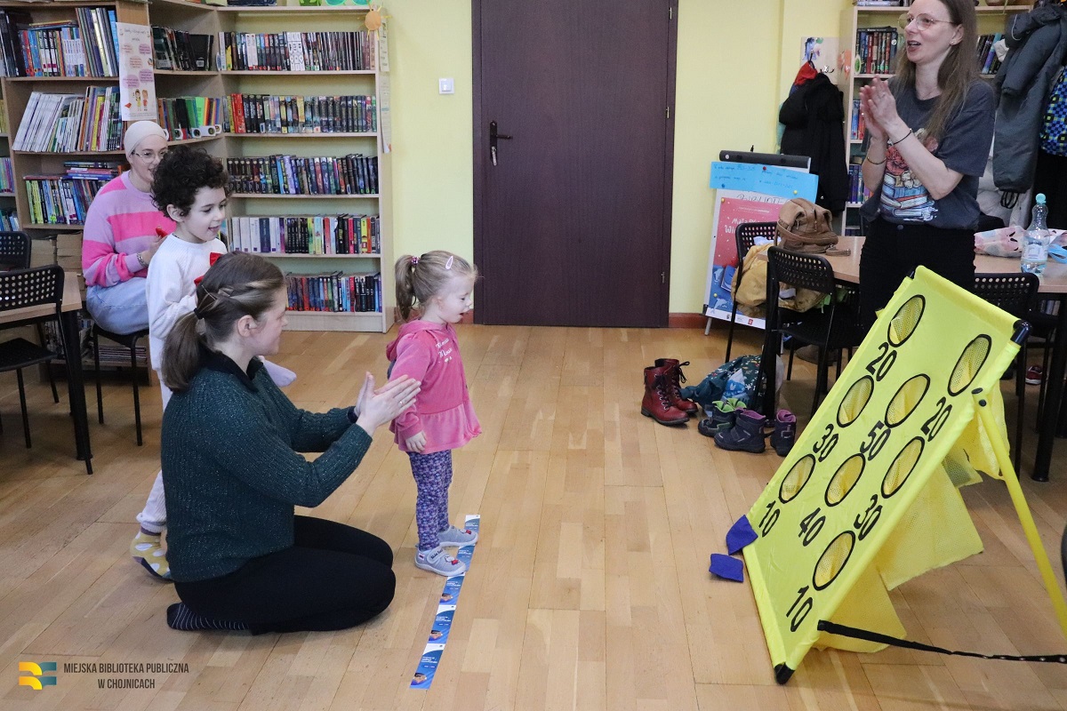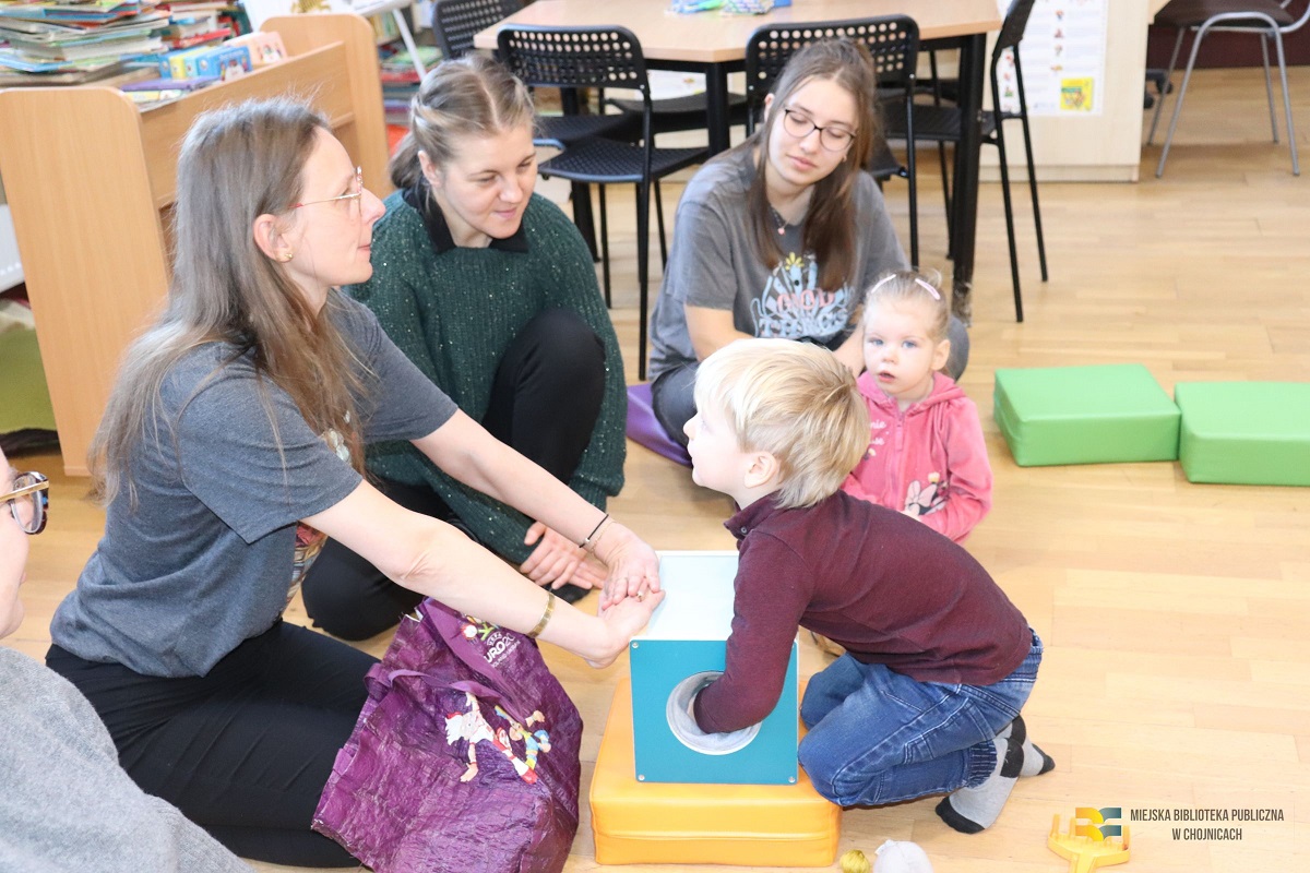 Uczestnicy z rozbawieniem słuchali czytanej opowieści. Po książce był czas na zabawę w zgadywanki, co ukryte zostało w tajemniczym pudełku. Zadanie wcale nie było łatwe. Wszyscy bardzo się starali zgadnąć. Następnie uczestnicy zajęć usiedli do stolików, aby wykonać puzzlową pracę plastyczną. Gdy wysiłek sięgnął zenitu, nadszedł czas na zabawę. Maluchy wraz z mamami stanęły do zabawy w rzucanie do celu na punkty. Emocji było sporo.