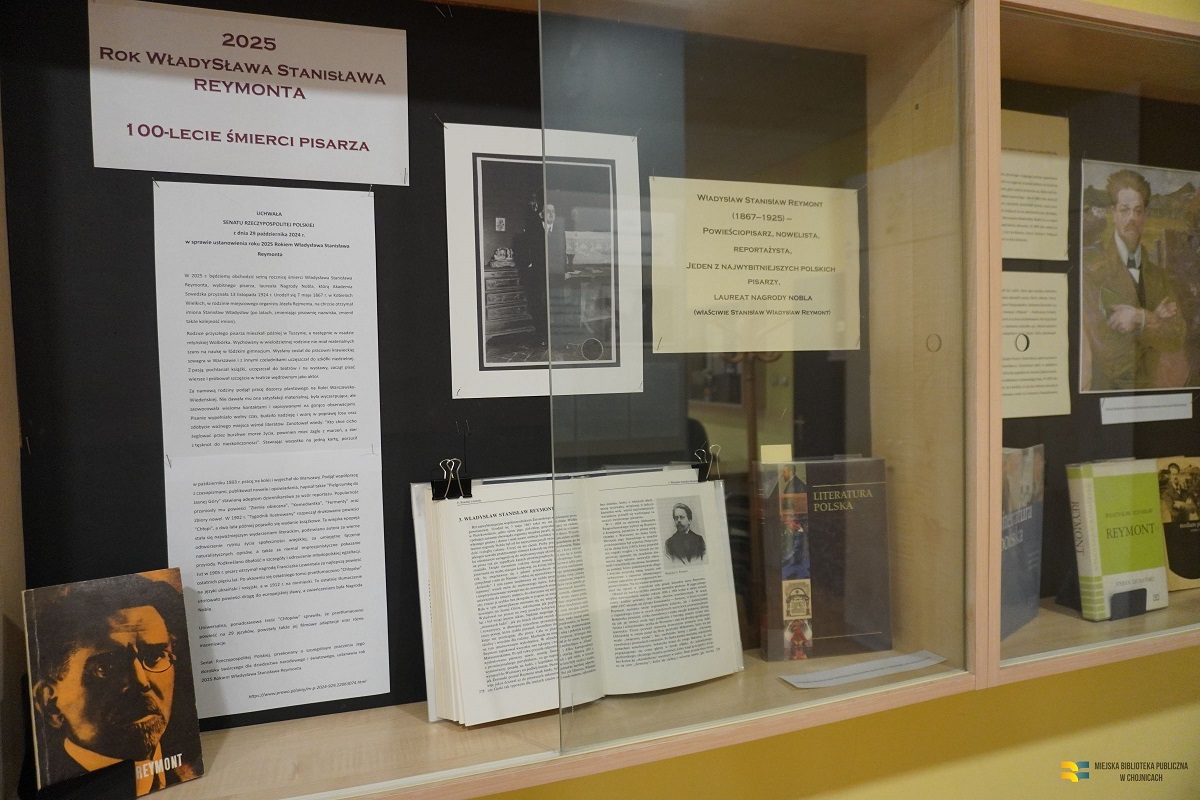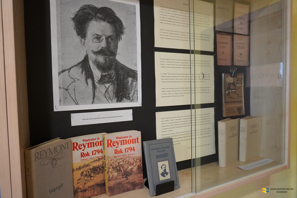 W pięciu gablotach prezentowana jest wystawa o Władysławie Stanisławie Reymoncie (1867-1925) – powieściopisarzu, noweliście, reportażyście, jednemu z najwybitniejszych polskich pisarzy, laureatowi Nagrody Nobla. Ekspozycja przypomina biografię i twórczość pisarza, który właściwie nazywał się Stanisław Władysław Reymont. Można obejrzeć kopie zdjęć oraz pierwszych wydań nowel i powieści, pochodzące z biblioteki cyfrowej POLONA. Eksponowane są też publikacje o Reymoncie, a także różne wydania jego powieści ze zbiorów Miejskiej Biblioteki Publicznej w Chojnicach. Najbardziej znane powieści pisarza – „Ziemia obiecana”, „Chłopi” i „Komediantka”, były kilkakrotnie przenoszone na ekran, o czym także można przeczytać na wystawie.