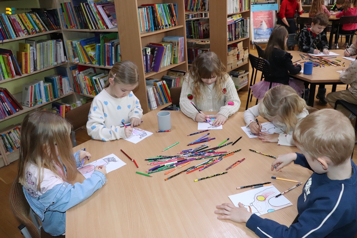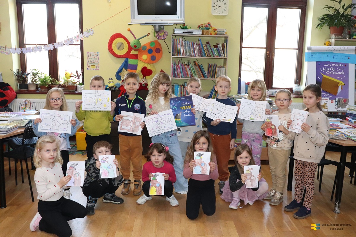 Po czytance nadszedł moment na wykonanie pracy plastycznej. Mimo że przedszkolaki nie miały za dużo czasu, to wszyscy świetnie sobie poradzili z zadaniem. Poza kolorowaniem narysowanego przez bibliotekarkę obrazka, projektowały krecie podziemne korytarze. Na zakończenie była wspólna fotografia.