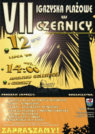 Zapraszamy wszystkich mieszkańców gminy Brusy na IGRZYSKA PLAŻOWE, które odbędą się w niedzielę 12 lipca 2009 roku na kąpielisku gminnym w Czernicy.Rozpoczęcie imprezy planowane jest na godz. 14.00.