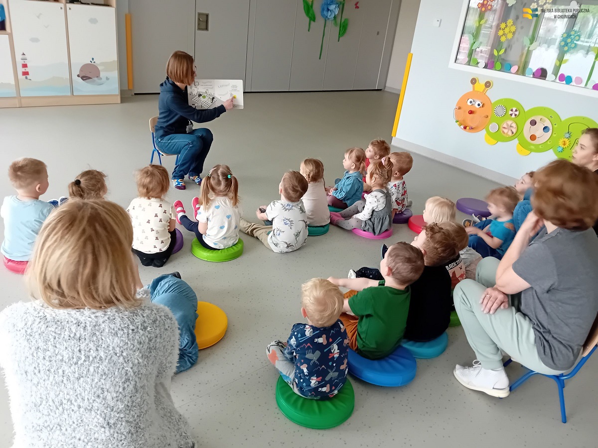 We wtorek 22 kwietnia 2025 roku, jak co miesiąc, bibliotekarka Wypożyczalni i Czytelni dla Dzieci udała się z wizytą do Żłobka Miejskiego nr 2, by poczytać dzieciom książki. Data spotkania nie była przypadkowa, ponieważ panie opiekunki zaplanowały, że dni od 22 do 25 kwietnia będą poświęcone książkom i czytelnictwu.