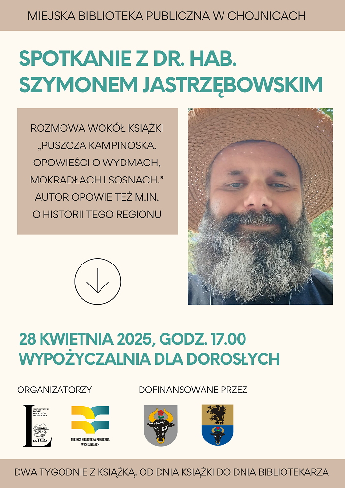 Gościem Dwóch tygodni z książką będzie doktor habilitowany Szymon Jastrzębowski, współautor książki „Puszcza Kampinoska. Opowieści o wydmach, mokradłach i sosnach. Przewodnik po krajobrazach przyrodniczo-kulturowych”. Spotkanie odbędzie się 28 kwietnia o godz. 17:00 w Wypożyczalni Literatury Pięknej i Popularnej dla Dorosłych.