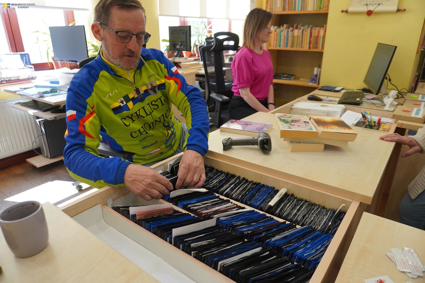 Rowerzysta i czytelnik, prezes Chojnickiego Towarzystwa Miłośników Roweru „Cyklista” Andrzej Beger w poniedziałek 28 kwietnia 2025 wypożyczał książki w ramach akcji Znani chojniczanie za biblioteczną ladą.