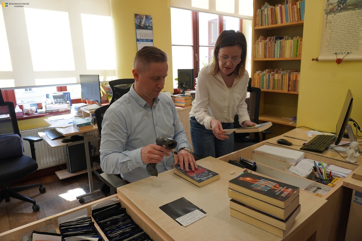Gość miał możliwość poznać pracę bibliotekarek, wypożyczyć książki czytelnikom, a także porozmawiać z nimi. Jak się okazało, niektórzy odwiedzający wypożyczalnię w tym dniu chętnie sięgają po książki historyczne i skorzystali z okazji, żeby podyskutować z Piotrem Skorupskim o historii, w tym naszego miasta.